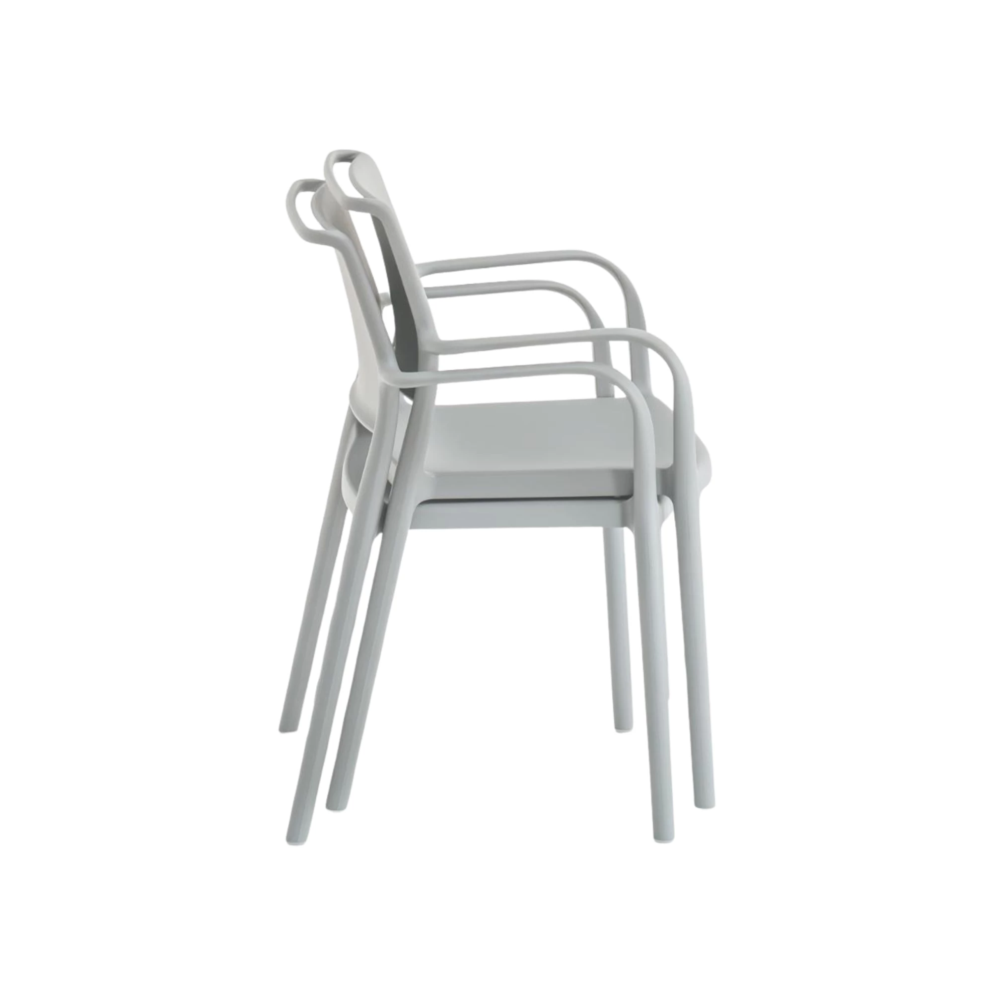 The Ara 315 is a polypropylene chair with armrests, designed for stacking and outdoor horeca use. Its distinctive upper backrest forms a large handle for easy lifting and moving. The tapered legs provide a light and elegant silhouette while ensuring durability and resistance. Available in multiple colors, it blends functionality with modern outdoor style perfectly.
