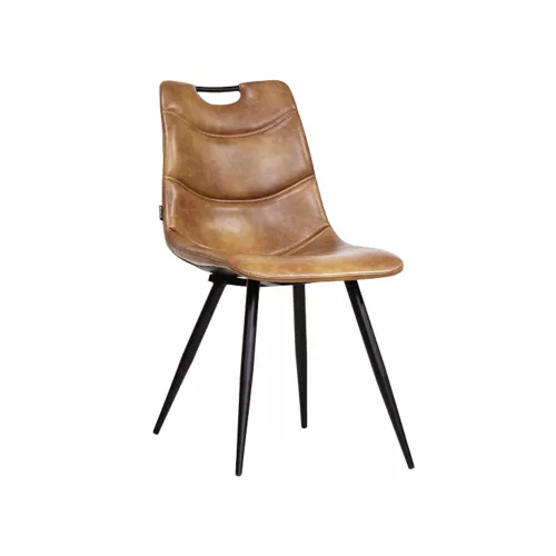 This chair features a leather-look upholstery paired with sturdy black metal legs, forming a bold and cohesive industrial design. Its robust appearance and refined contrast make it a perfect addition to modern or industrial-style interiors. Both stylish and durable, this chair is ideal for contemporary hospitality settings.