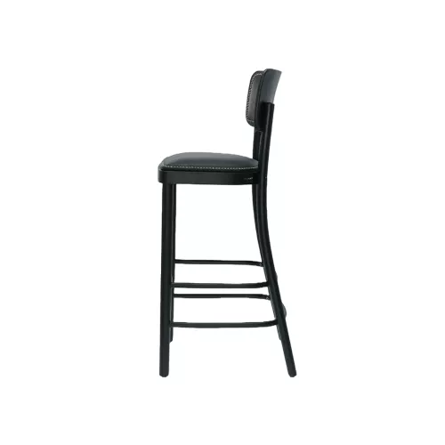The Bridged BK wooden barstool combines classic elegance with modern comfort. Featuring a solid beech wood frame and wooden footrest, it has an upholstered seat and backrest highlighted by decorative tacks. Available in a wide range of professional fabrics or faux leather and multiple wood stain colors, perfect for bars and horeca spaces.