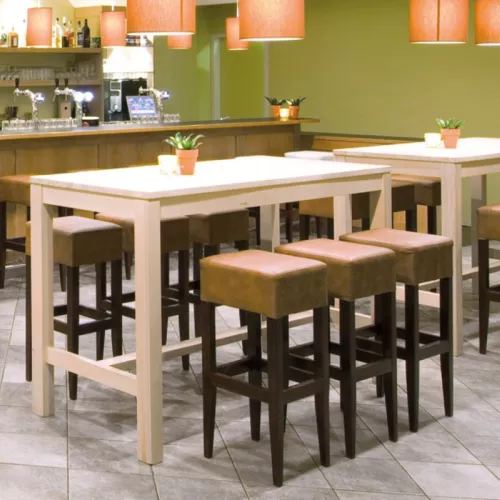 The Cleo Bar Table is a refined and sturdy solution designed for the hospitality sector, offering a balance of timeless elegance and functionality. Made from solid oak wood, it features a beautifully smooth top finish and straight 7x7 cm legs that ensure both visual stability and long-lasting strength. The table is available in a wide range of dimensions and wood finishes, allowing seamless integration into various bar, restaurant, or café interiors. For added durability and protection in high-traffic areas, the Cleo Bar Table can be optionally equipped with an inox foot strip. Ideal for establishments seeking a natural, durable, and customizable solution for their high-use bar areas.