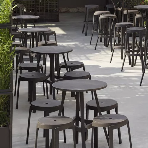 Combo 70 is a versatile outdoor table designed for horeca terraces. Built with a central column and four legs, it’s made of regenerated fiberglass polypropylene with UV protection. Available in matte finish, with a 70 or 60 cm round top and 75 cm height.