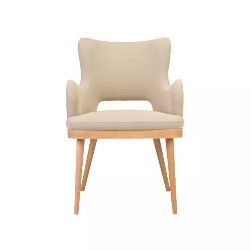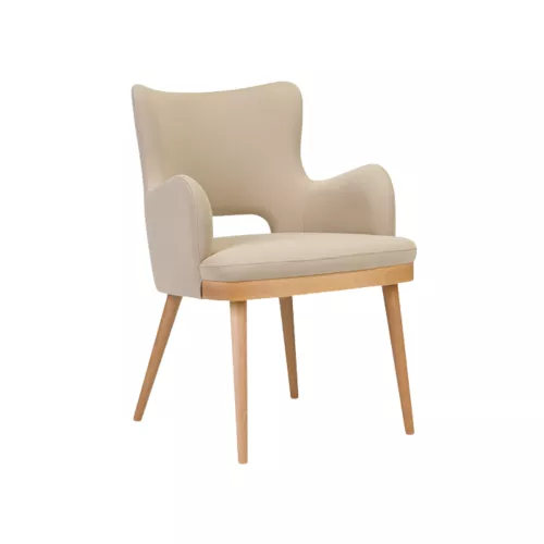 Kelly Flow Hole is a wooden chair with armrests, featuring a distinctive cutout backrest. The beech wood frame, available in various stain colors, pairs with a fully upholstered seat and backrest. Designed for horeca use, it combines mid-century modern elegance with professional-grade comfort and durability for high-traffic environments.