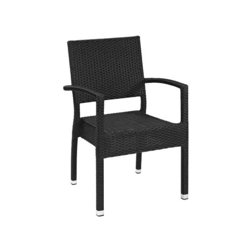 Mond A is a stylish outdoor chair with armrests, designed specifically for horeca use. Built with a powder-coated aluminium frame and finished with black flat P.E. wicker on the seat and backrest, it ensures both comfort and resilience. Weather- and UV-resistant, and stackable up to 8 units, it's perfect for terraces and outdoor hospitality spaces.