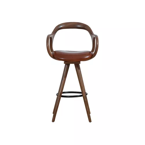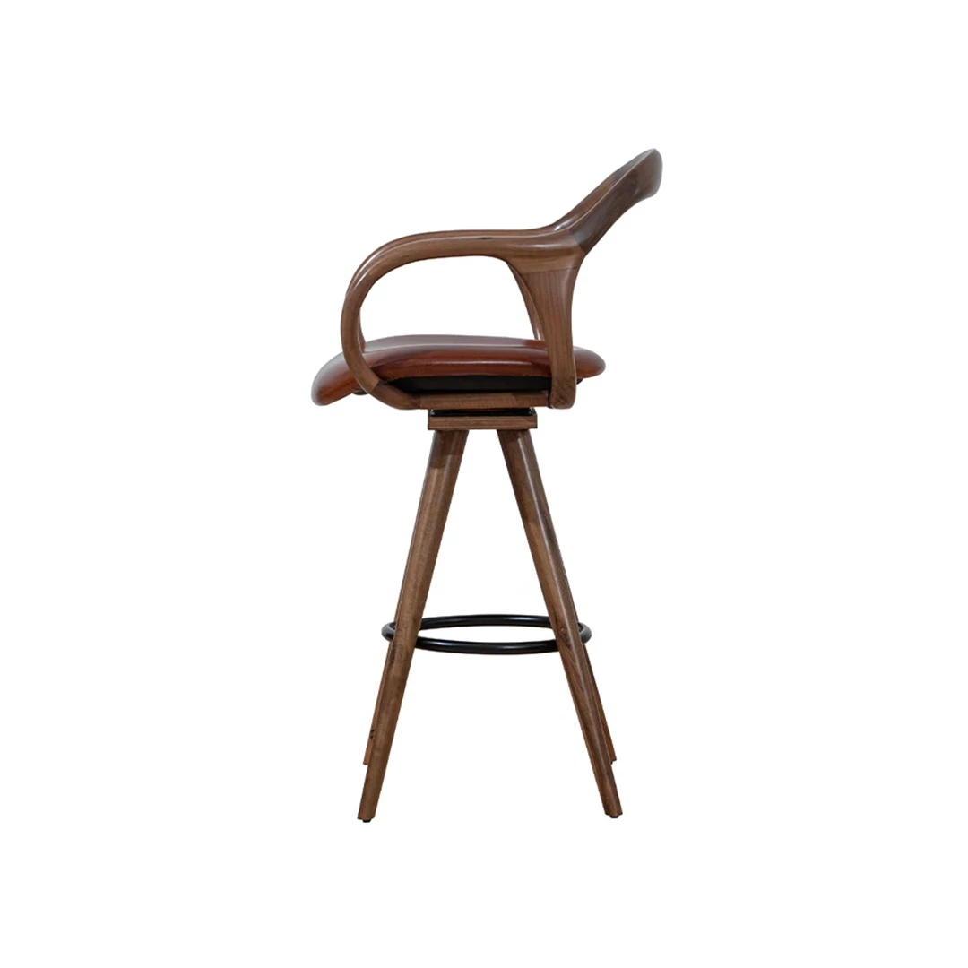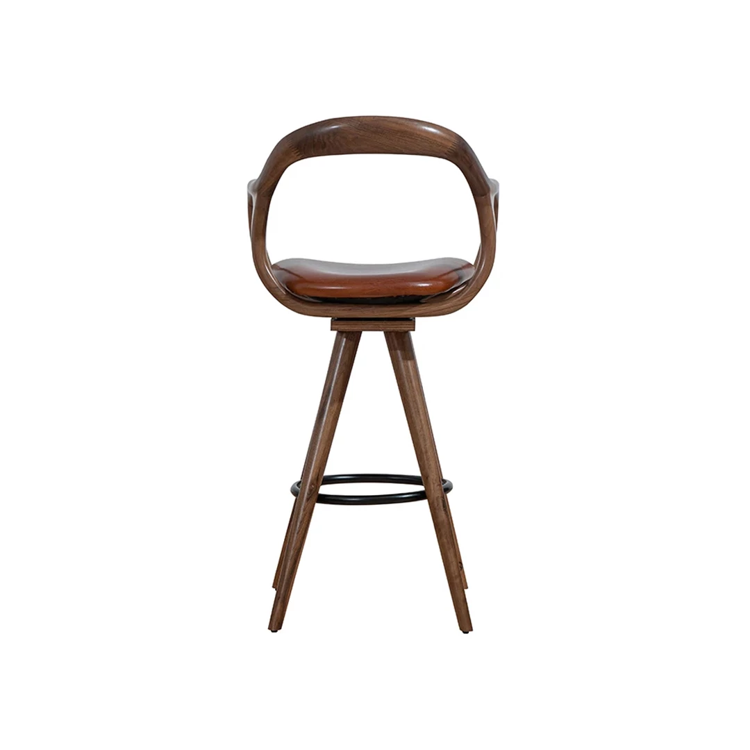The Nelas BK barstool blends minimalist, natural design with comfort and durability. Its beech wood frame, available in multiple colors, features rounded wooden backrest and armrests, a metal footrest, and an upholstered seat. Ideal for bars, hotels, and diverse horeca spaces, with upholstery in professional fabrics or faux leather.