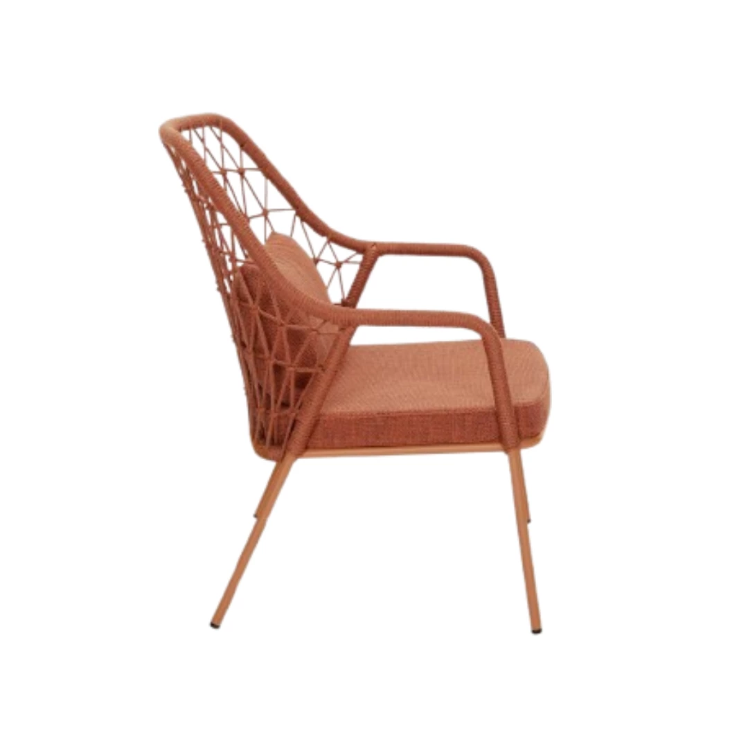 Panarea 3679 is a stylish lounge armchair with a hand-woven Italian polypropylene cord wrapping a durable Ø 20 mm steel frame. Its dry-feel polyurethane seat cushion, upholstered in matching yarn fabric, and supportive armrests make it perfect for indoor restaurants and elegant hospitality spaces.