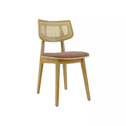 Pellman Cane is a stylish and comfortable chair designed for modern hospitality settings. Its solid beech wood frame, finished with polyurethane lacquer and available in multiple stains, ensures durability. The cane backrest adds elegance, while the upholstered seat with high-density foam delivers lasting comfort. Fully customizable with a wide range of professional fabrics.