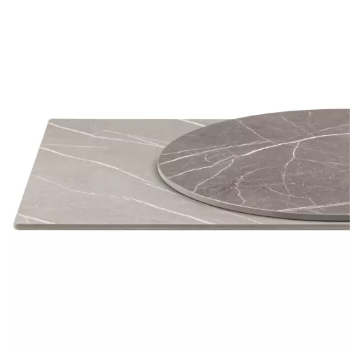 High-pressure solid laminate tops crafted from resin-infused paper layers deliver both durability and refined aesthetics. The stone-look surface adds a natural touch, available in multiple shapes and sizes to suit various HoReCa layouts. Thickness: 10 mm.