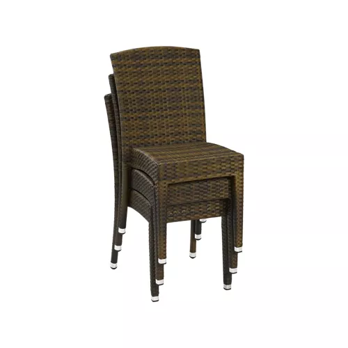 Titus Brown S is a stylish outdoor chair designed for horeca environments. Featuring a powdercoated aluminium frame and a flat P.E.-Wicker seat and backrest in a warm burned tone, it’s UV and weather resistant and stackable up to 8 pieces. Its durable build and timeless look suit a wide range of outdoor settings. An optional water-repellent seat cushion is also available.