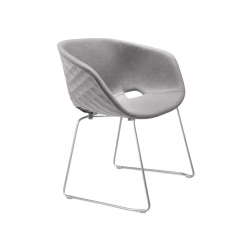 Uno 595M is a professional horeca chair with armrests and a sled-style steel frame, available in powder-coated or chromed finish. It combines a durable polypropylene outer shell with an upholstered inner seat, offered in a wide range of fabrics or faux leather. The customizable frame and shell colors allow for seamless integration in various hospitality interiors.