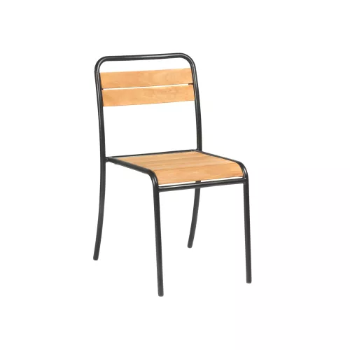 This elegant outdoor terrace chair combines a strong metal frame with the natural beauty of chestnut wood, creating a perfect blend of durability and design. Its structure is specially engineered to withstand outdoor conditions, making it ideal for restaurant patios, garden cafés, and hospitality terraces. The chair is available in a wide range of RAL colors, allowing businesses to match their branding or design concept effortlessly. With a stylish look and weather-resistant construction, this chair offers both functionality and visual appeal for high-traffic outdoor environments.