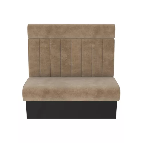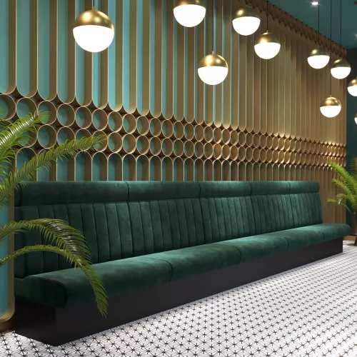 This upholstered modular bench with a chipboard sockel offers a flexible and stylish seating solution for modern horeca interiors. Inspired by the classic American diner, this custom-made bench combines aesthetic appeal with practical durability. The seat is filled with high-density foam, providing long-term comfort under heavy use. Upholstery can be customized in a wide range of professional fabrics or synthetic leather, and the option to supply your own material is available for a fully personalized look.