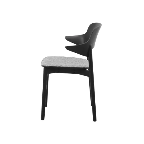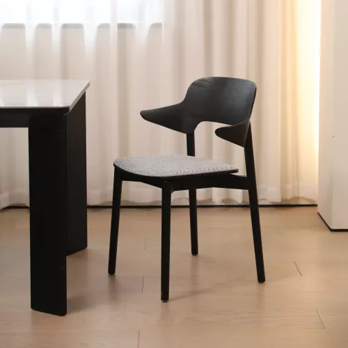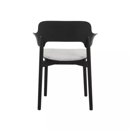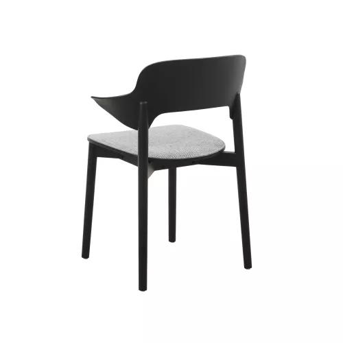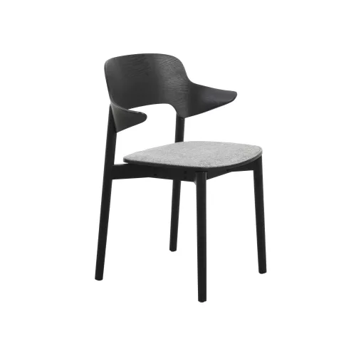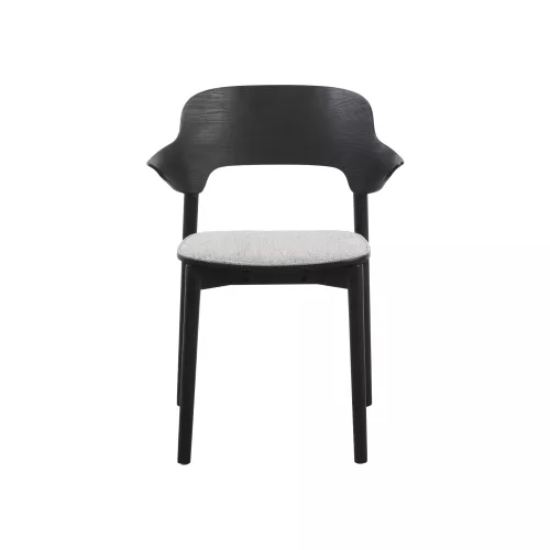 Contemporary oak chair with armrests and upholstered seat for added comfort. Crafted from solid wood, it suits elegant HoReCa environments. Available in multiple wood finishes and customizable fabrics.