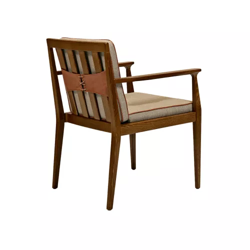 Aurora is a refined wooden chair with armrests, designed for comfort and durability. Its beech wood frame is available in various stains, while the upholstered seat and backrest offer a wide selection of professional fabrics or faux leather. Ideal for high-traffic interiors, it brings elegance and resilience together.