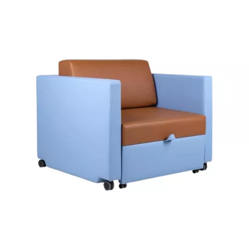 Avelar is a multifunctional armchair designed for horeca environments where flexibility and comfort matter. With a solid beech wood frame, it easily transforms into a single fold-out bed, offering a practical solution for hotel rooms or healthcare facilities. Upholstered in professional fabrics or faux leather, Avery blends style with utility in high-traffic interiors.