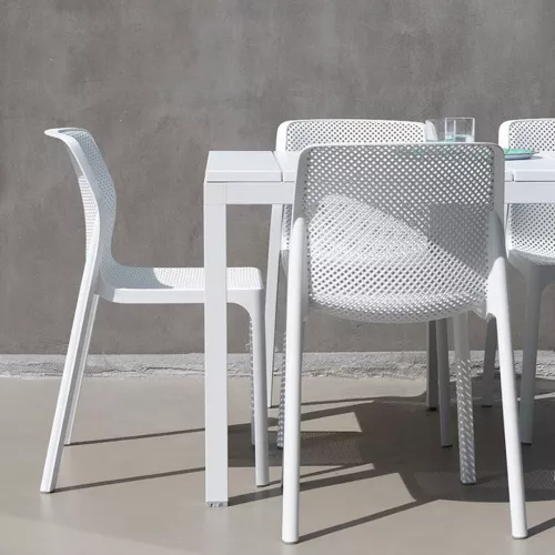 Bit is a modern monobloc outdoor chair made from uniformly colored fiberglass polypropylene with UV additives. Its matte finish, recyclable resin, and availability in multiple colors make it a stylish and sustainable choice for any HORECA terrace.