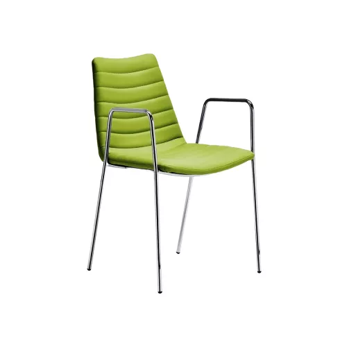 The Cover P M TS upholstered chair with metal armrests merges refinement and elegance with functional design. Its four-leg metal base, in lacquered or chrome finish, supports a comfortable upholstered shell. Fully stackable up to 4 pieces, it is available in a wide range of professional fabrics or faux leather for versatile interiors.