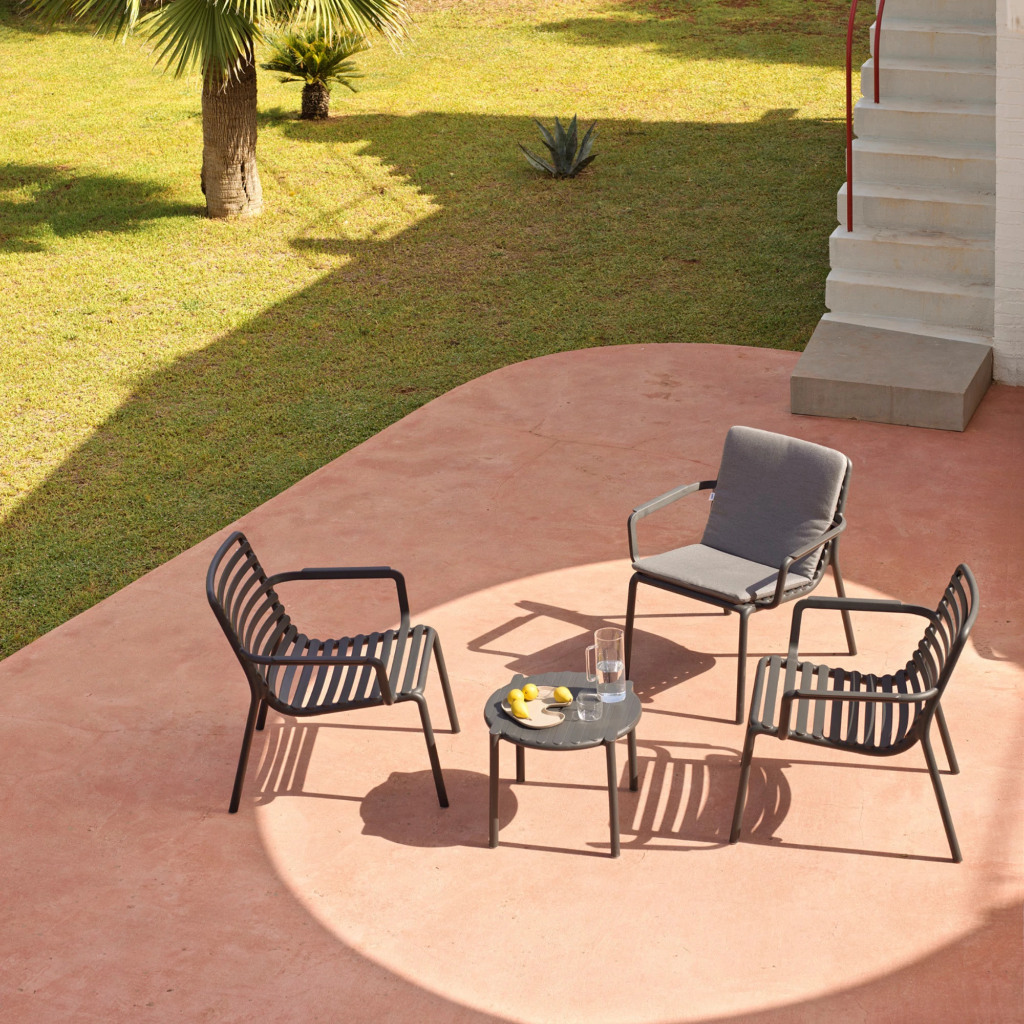 Doga Relax is a stylish and durable monobloc armchair, designed specifically for outdoor use. Made from uniformly colored fiberglass polypropylene resin with UV additives, it resists fading and weather damage, making it ideal for terraces, patios, gardens, or any outdoor setting. The chair is available in a wide range of contemporary colors: white, anthracite, cappuccino, mint, agave, pear, marsala, and tobacco — offering aesthetic versatility for any design scheme. It features a matte finish, non-slip feet for added stability, and a stackable design that makes storage simple and efficient. A matching cushion is available upon request, adding an extra layer of comfort. Doga Relax is made from recyclable resin, reflecting a commitment to sustainability without compromising on style or function.