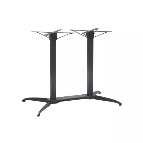 Flexi Feet D is a double-column table base with a patented system that self-adjusts to uneven surfaces for maximum stability. The demountable cross enables fast tabletop removal. Available in galvanized or black powder-coated finish. Ideal for 70x100 cm tops. Designed for both indoor and outdoor settings, this disassembled model combines durability and design flexibility.