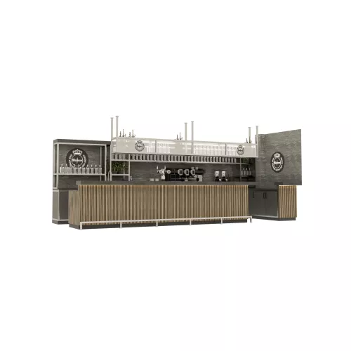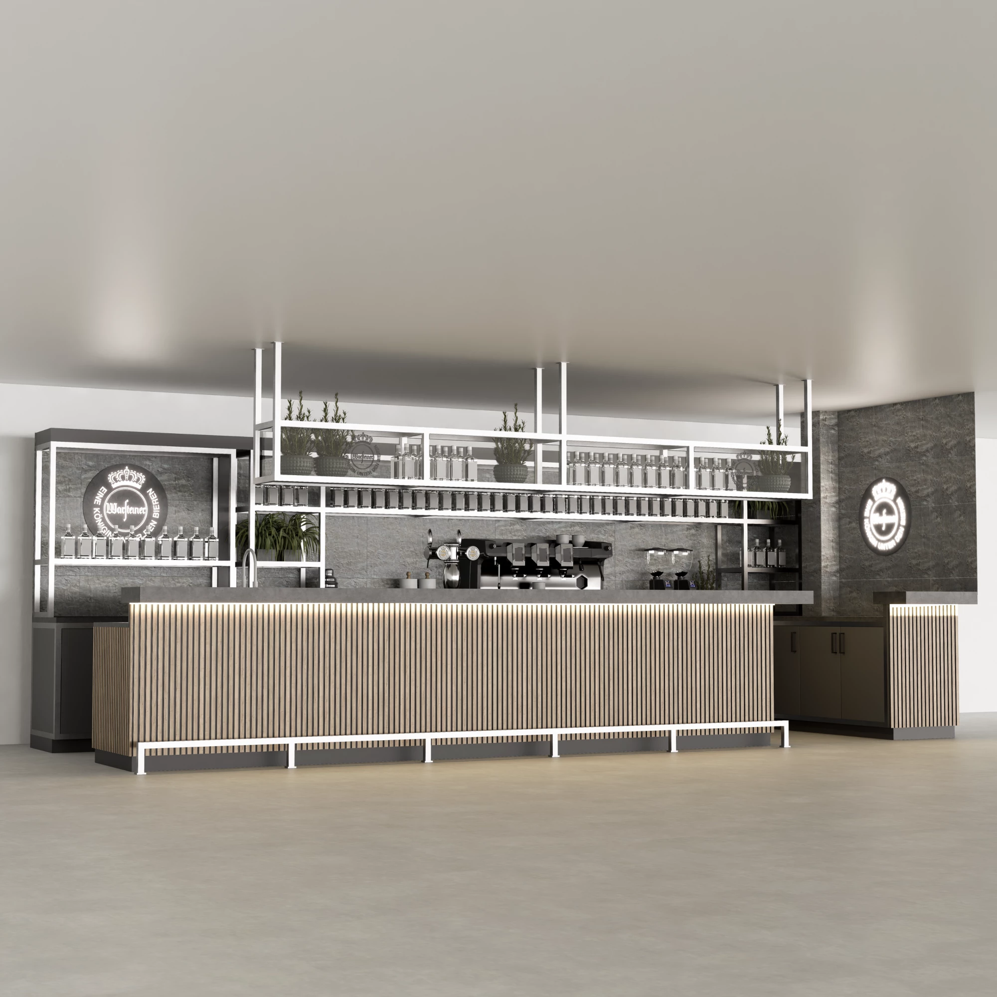 A refined, modern bar concept where natural textures, cool metals, and warm lighting come together in a beautifully balanced composition.