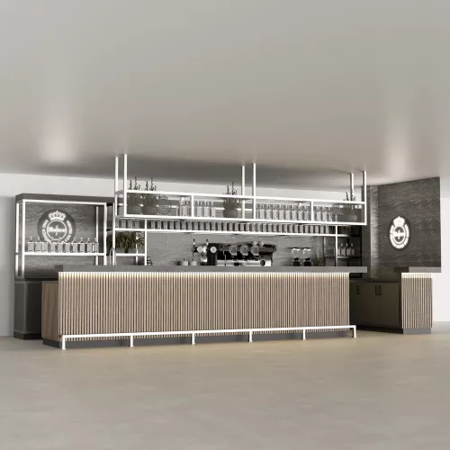 The service and worktop are finished in a slate-look HPL, offering the depth and sophistication of stone while maintaining a sleek, practical surface. Along the front edge, soft indirect LED lighting at 2700K adds a warm glow, giving the bar an inviting, floating effect.