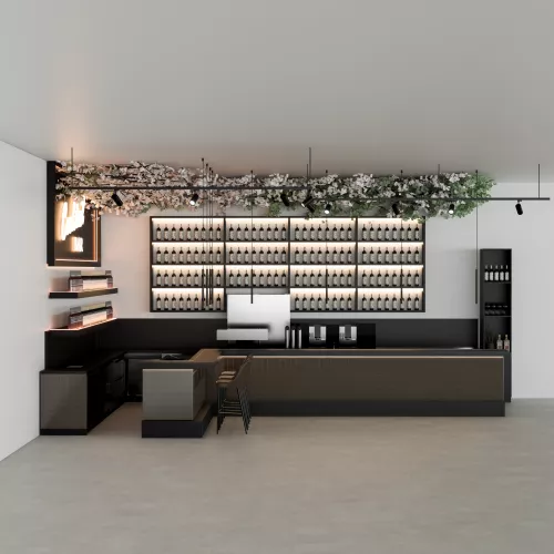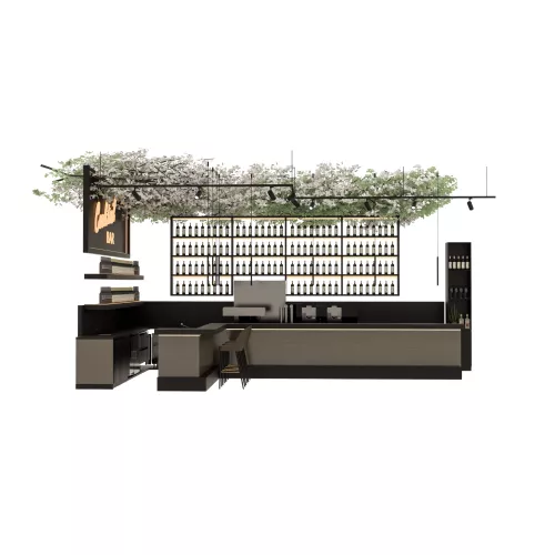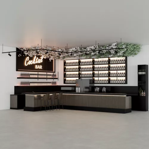 A custom contemporary modern bar concept designed for stylish indoor café and restaurant environments. The entire design is available in 3D, offering a clear and immersive preview of the final look.