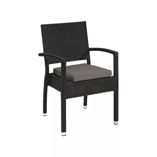 Mond A is a stylish outdoor chair with armrests, designed specifically for horeca use. Built with a powder-coated aluminium frame and finished with black flat P.E. wicker on the seat and backrest, it ensures both comfort and resilience. Weather- and UV-resistant, and stackable up to 8 units, it's perfect for terraces and outdoor hospitality spaces.