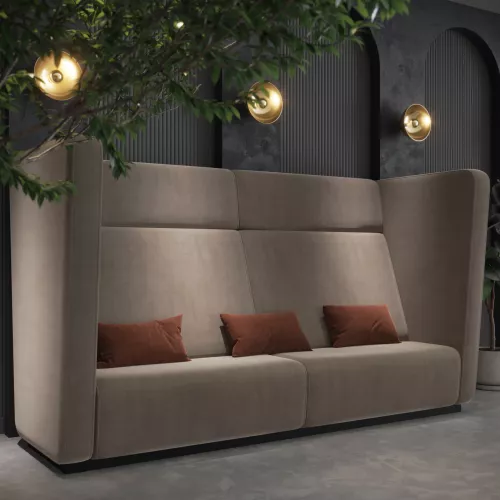 The Parleur Bench is a modular dining bench with a high back and armrests, designed for comfort and style in horeca environments. Upholstered in high-density foam for long-lasting use, it is available in various fabrics or faux leather. Fully customizable in size, it adapts perfectly to any interior style or hospitality setting.