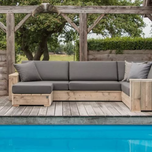 Pinewood sofa in raw finish, ideal for outdoor use. Available in white wash, black wash, or transparent coating. The cushions come in outdoor fabrics and are available in various colors.