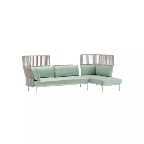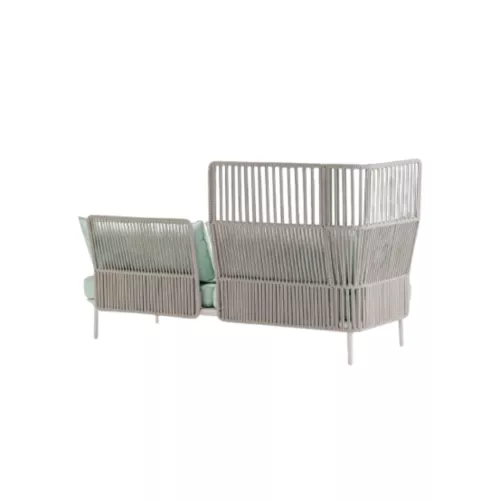 Reva Cocoon RVC025/026 features an extruded aluminium frame on four die-cast legs and stainless steel backrests wrapped in woven polypropylene cord. Its cushions include a waterproof protective cover and fabric upholstery, offering refined comfort for outdoor terraces, lounges, and restaurants. As a modular system, it allows multiple configurations to suit a variety of settings.