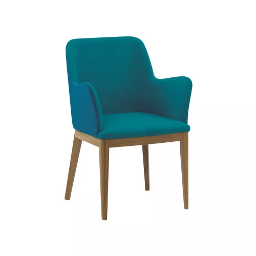 Tabby A is a durable, upholstered chair with armrests, designed specifically for horeca environments. Its solid beech wood frame is available in a variety of wood stain finishes. With upholstery options ranging from hard-wearing fabrics to faux leather, it adapts to both intense use and diverse interior design schemes, offering flexibility for restaurants, cafes, hotels, and more.
