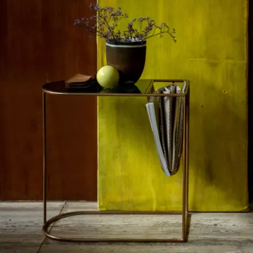 The Velora Side Table brings elegance and function to any horeca space. Its copper-toned steel frame and glossy smoky glass top create a refined look, while the built-in magazine rack adds practicality. With its slender silhouette and 51 cm height, it fits beautifully next to lounge seating, creating a warm and inviting corner for guests.
