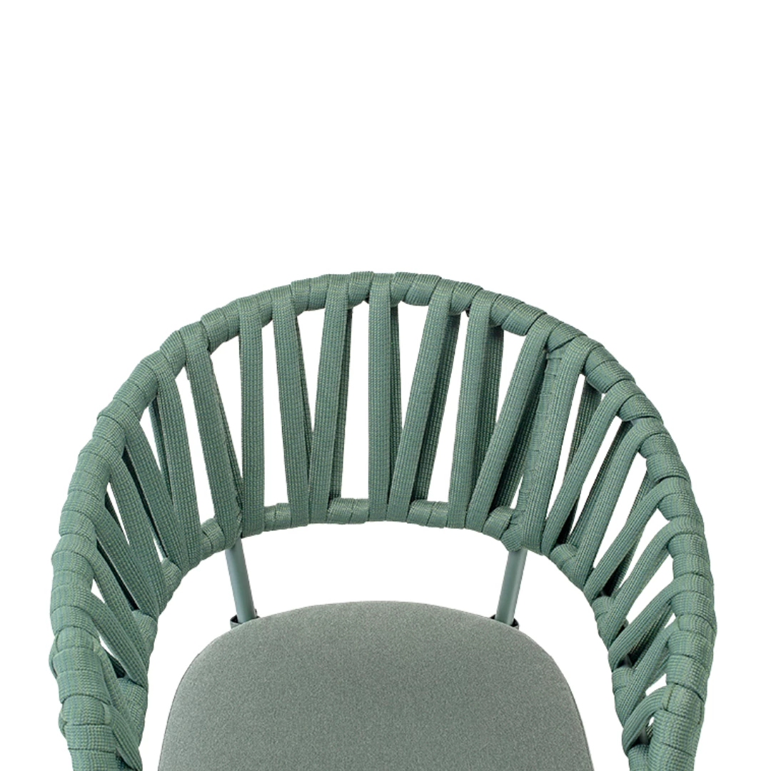 Victory is a stackable outdoor armchair with an aluminium frame, elegantly wrapped in durable acrylic rope. It includes a seat cushion upholstered in water-repellent Olefin fabric, offering long-lasting comfort. Designed for horeca terraces, it brings both function and sophisticated design to any outdoor space.