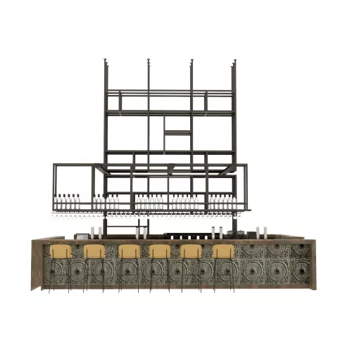 A bar designed for modern hospitality spaces, merging warmth, metallic sophistication, and architectural style into a refined centerpiece.
